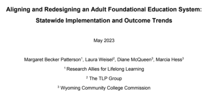 From 2014 to 2018, Research Allies for Lifelong provided research and evaluation services to Align and Redesign, an initiative designed to transform adult education systemically. In 2017, A & R leaders published an evaluation of A & R professional learning in Wyoming, the first state to implement this statewide professional learning initiative. The Wyoming implementation results and outcome trends from seven years of data were summarized in 2023.